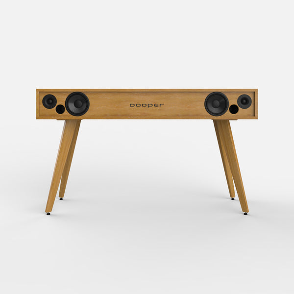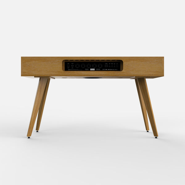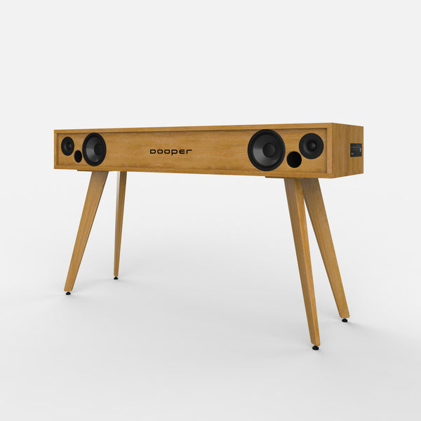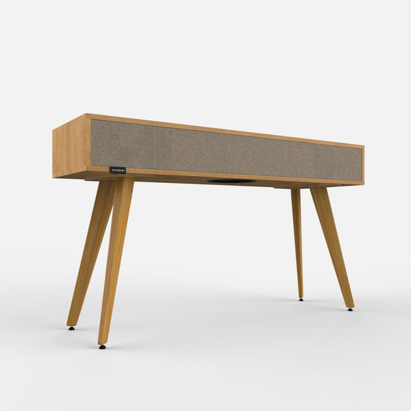 Exterior de madera de roble macizo de proximidad con certificación PEFC y FSC tratado con aceites naturales. Recintos interiores fabricados con tablero de abedul contrachapado y encolado fenólico. Marco frontal elaborado artesanalmente con tejido ecológico de médula de ratán o tela acústica ignífuga de polipropileno.