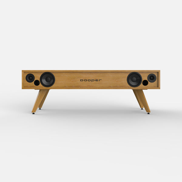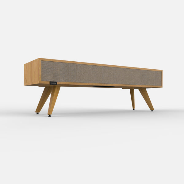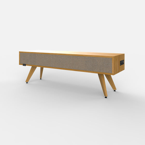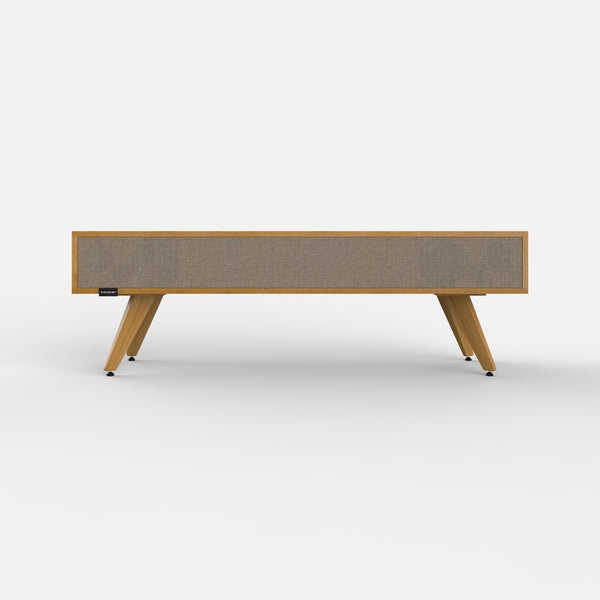 Exterior de madera de roble macizo de proximidad con certificación PEFC y FSC tratado con aceites naturales. Recintos interiores fabricados con tablero de abedul contrachapado y encolado fenólico. Marco frontal elaborado artesanalmente con tejido ecológico de médula de ratán o tela acústica ignífuga de polipropileno.